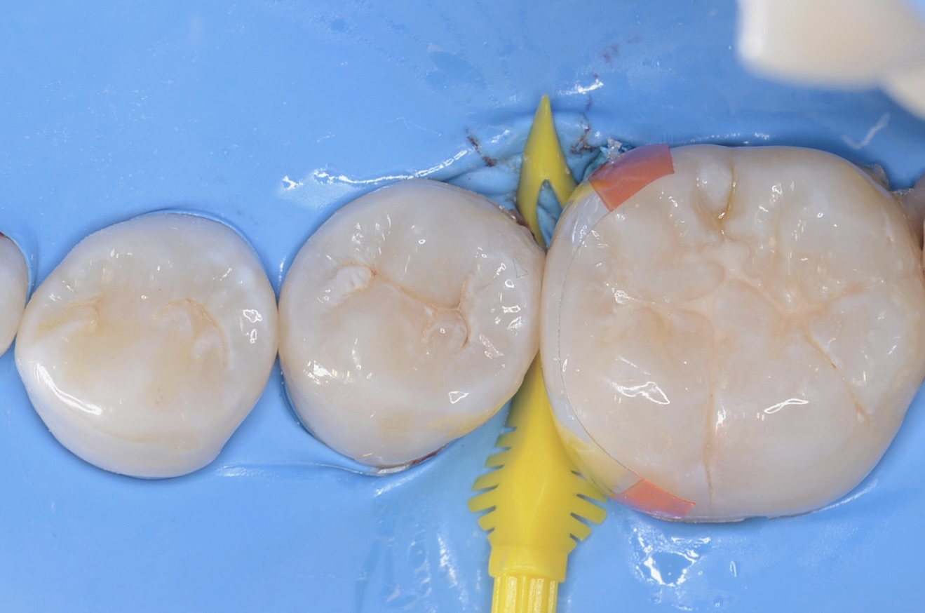 フロワブルレジンを充填・硬化させた後に透明フィルムを外してから研磨をします。 フロスが引っかからないかを確認します。 -