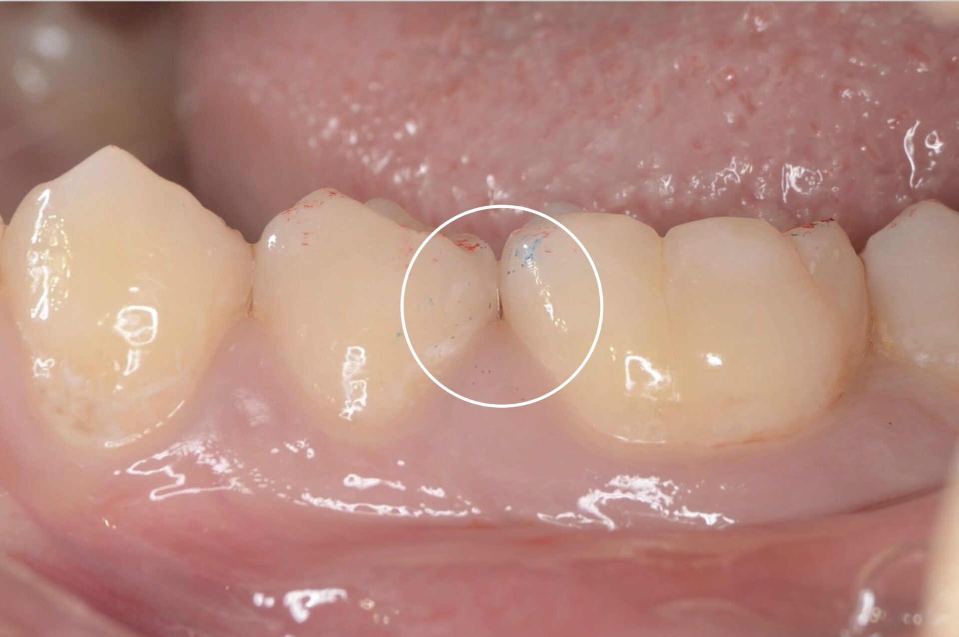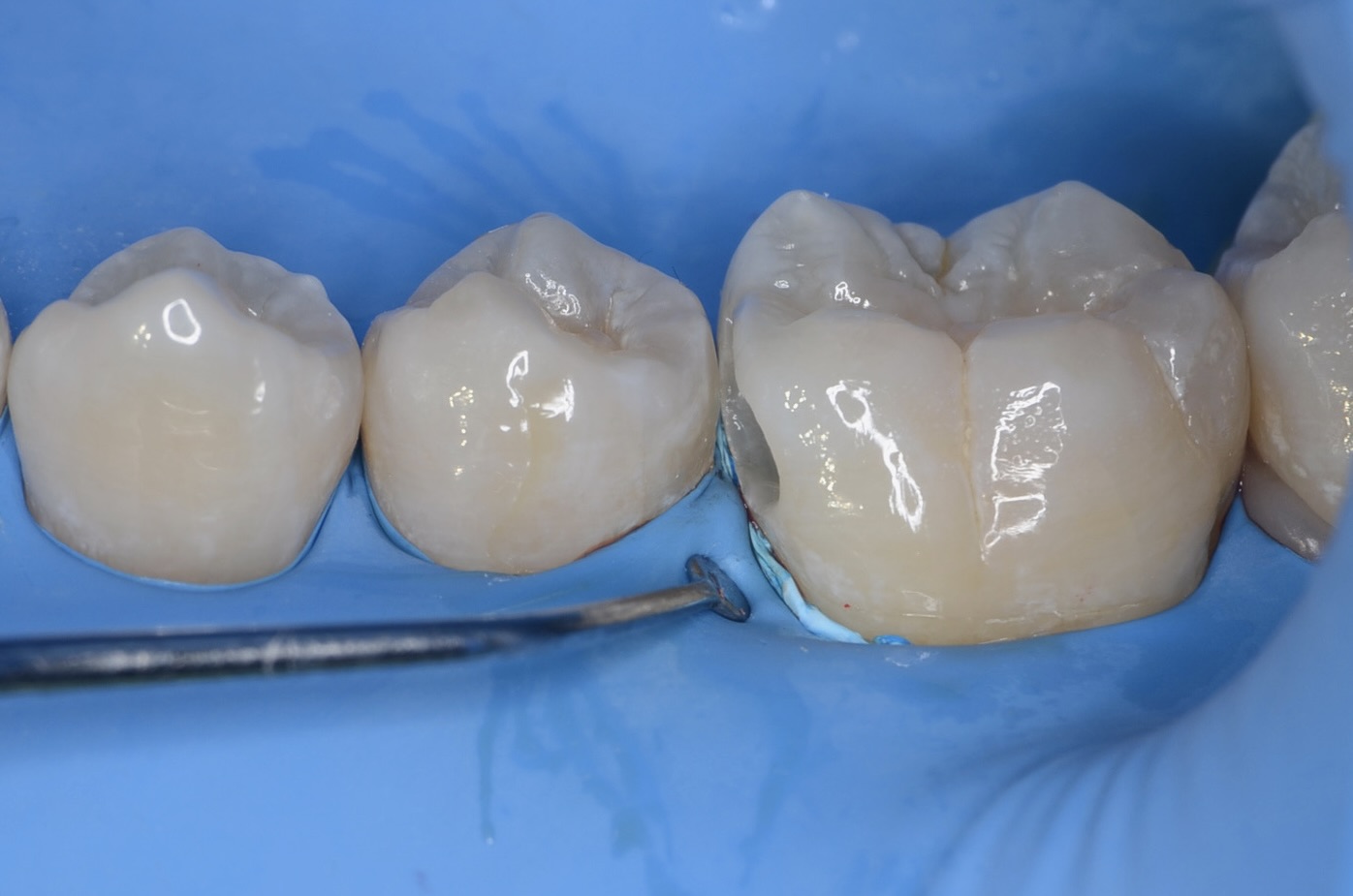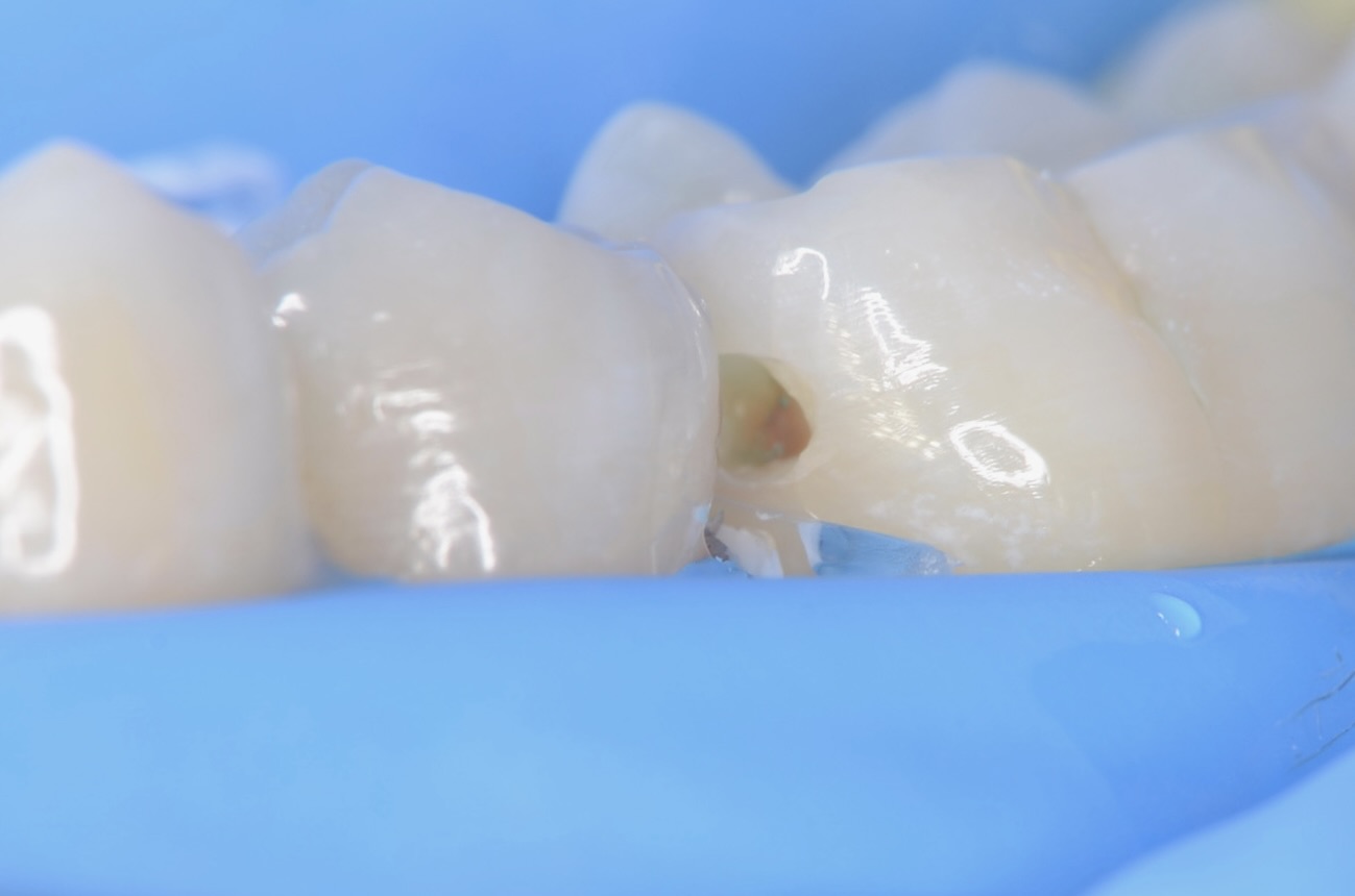 テフロンテープを歯肉溝に入れて、もう一段歯肉の位置を下げます。これにより、歯質が現れ、接着充填操作がしやすくなります。 -