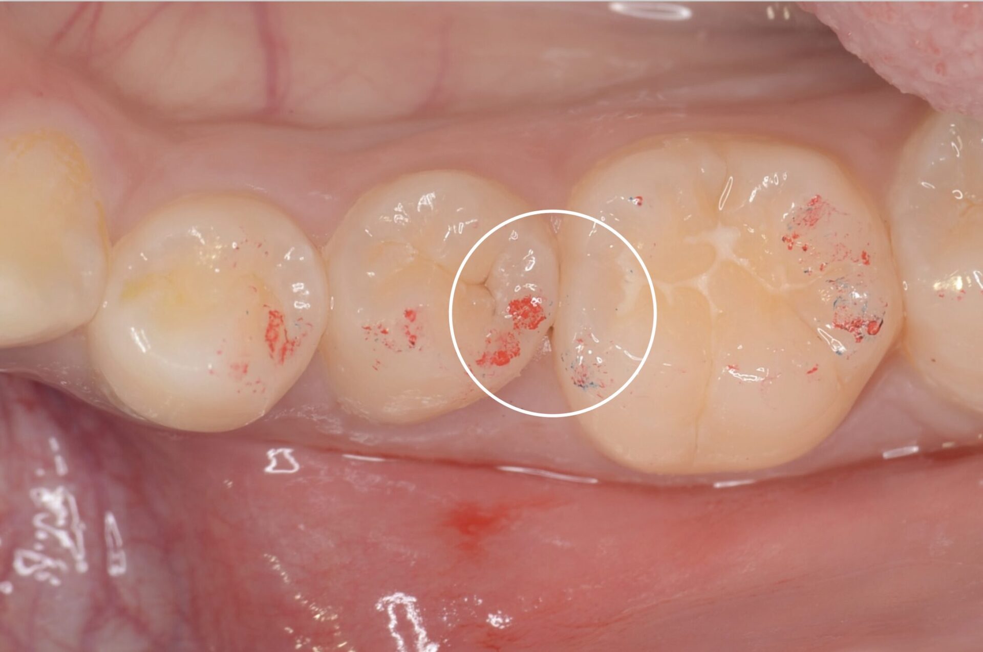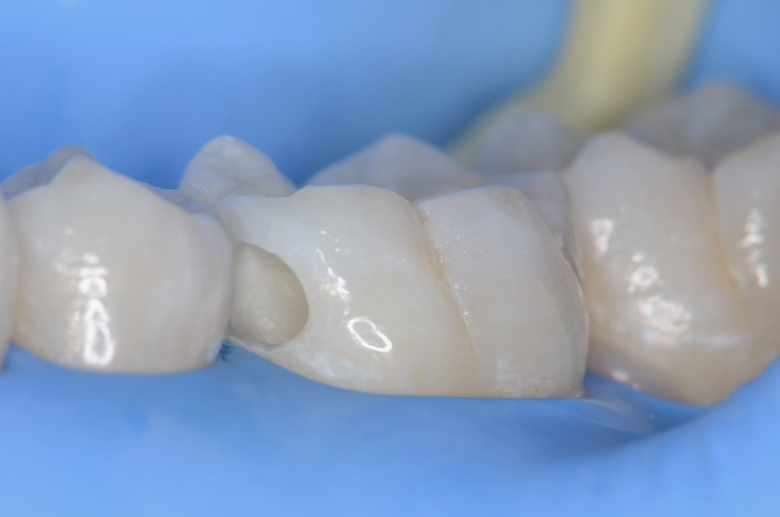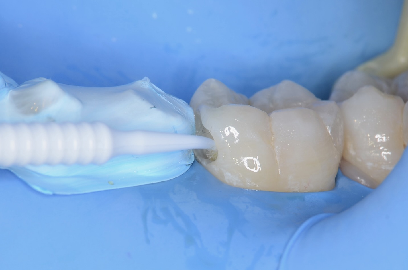 テフロンテープを歯肉溝に入れて、もう一段歯肉の位置を下げます。これにより、歯質が現れ、接着充填操作がしやすくなります。 -