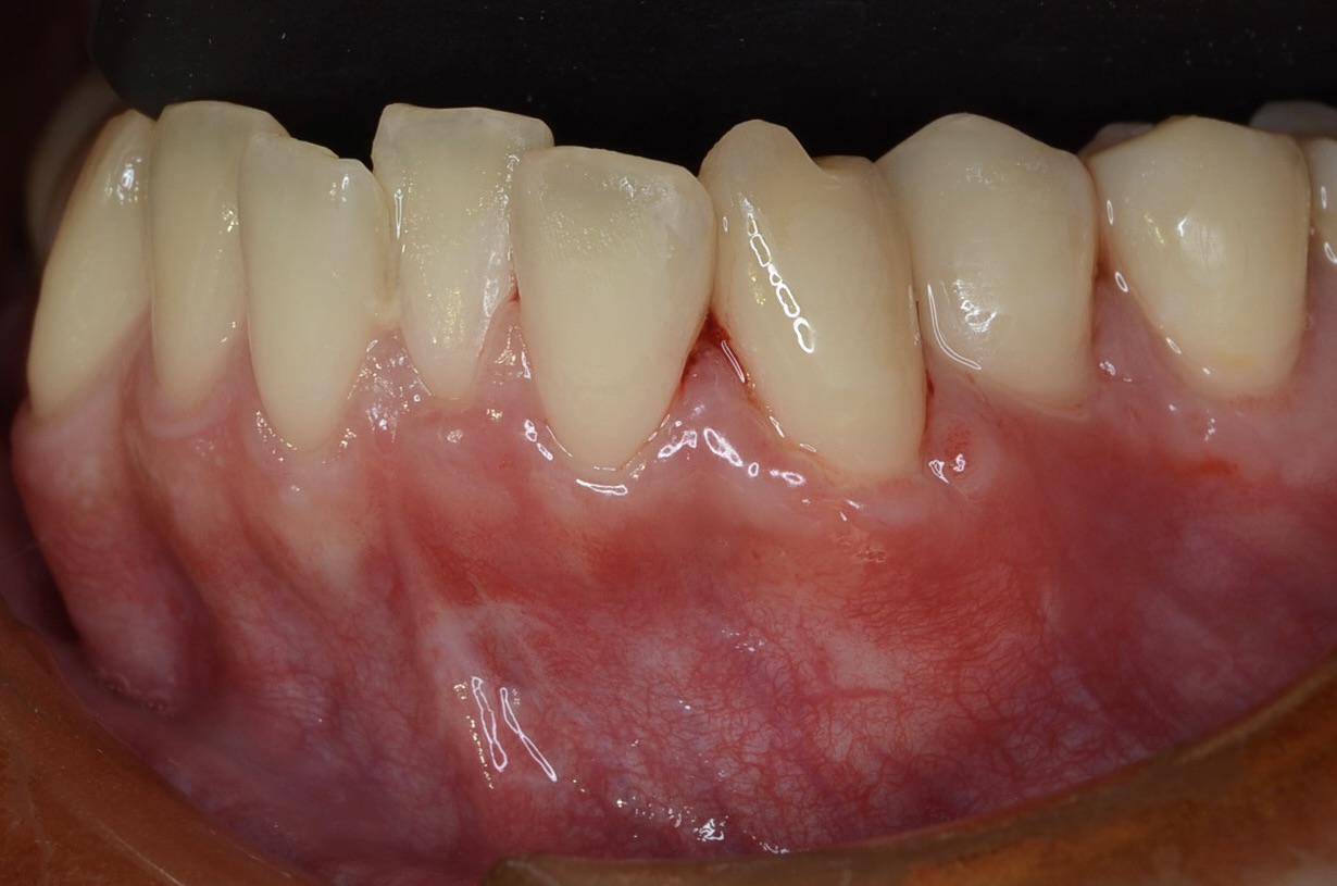 板橋区からお越しの患者さんです。20代の頃から左下の歯茎が下がっていましたが、ここ数年で歯肉退縮が進行してきました。患者さんと相談の結果、根面被覆をすることになりました。この患者さんは、左上に、当院での根面被覆の経験があります。