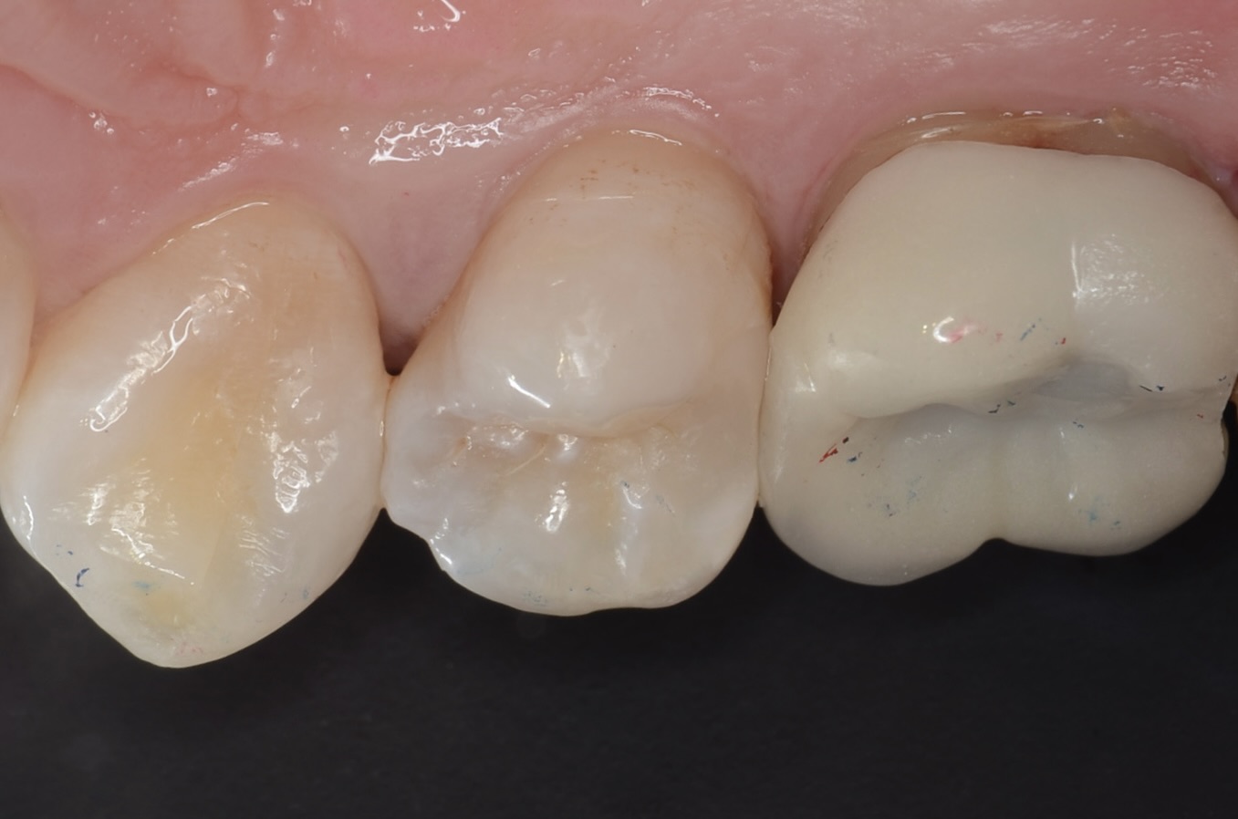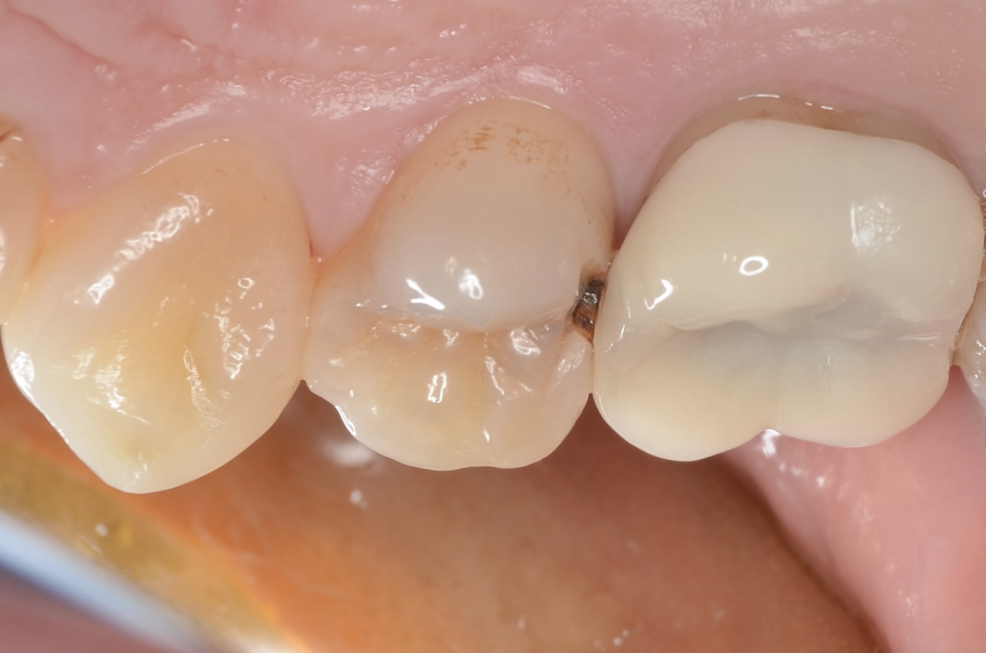 遠心の歯が欠けて黒くなっています。 -