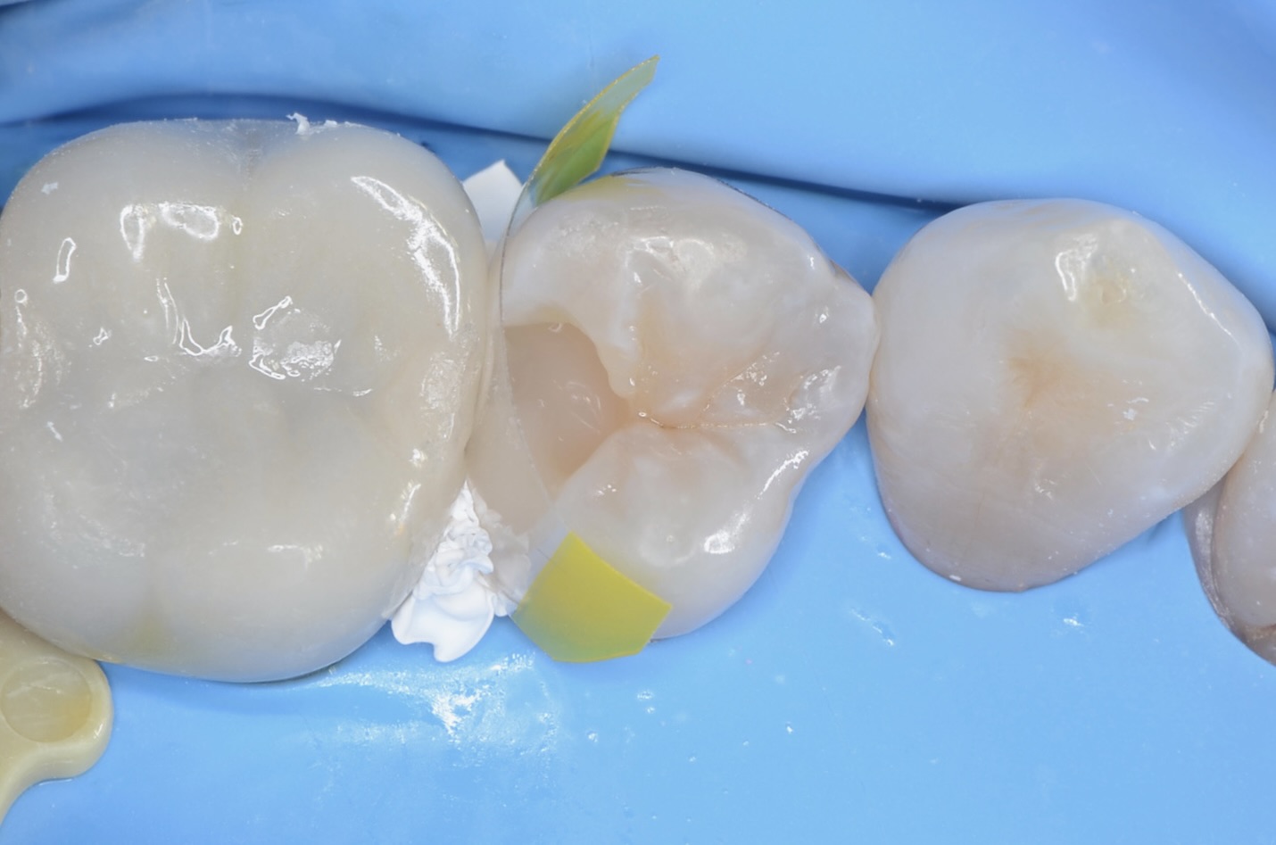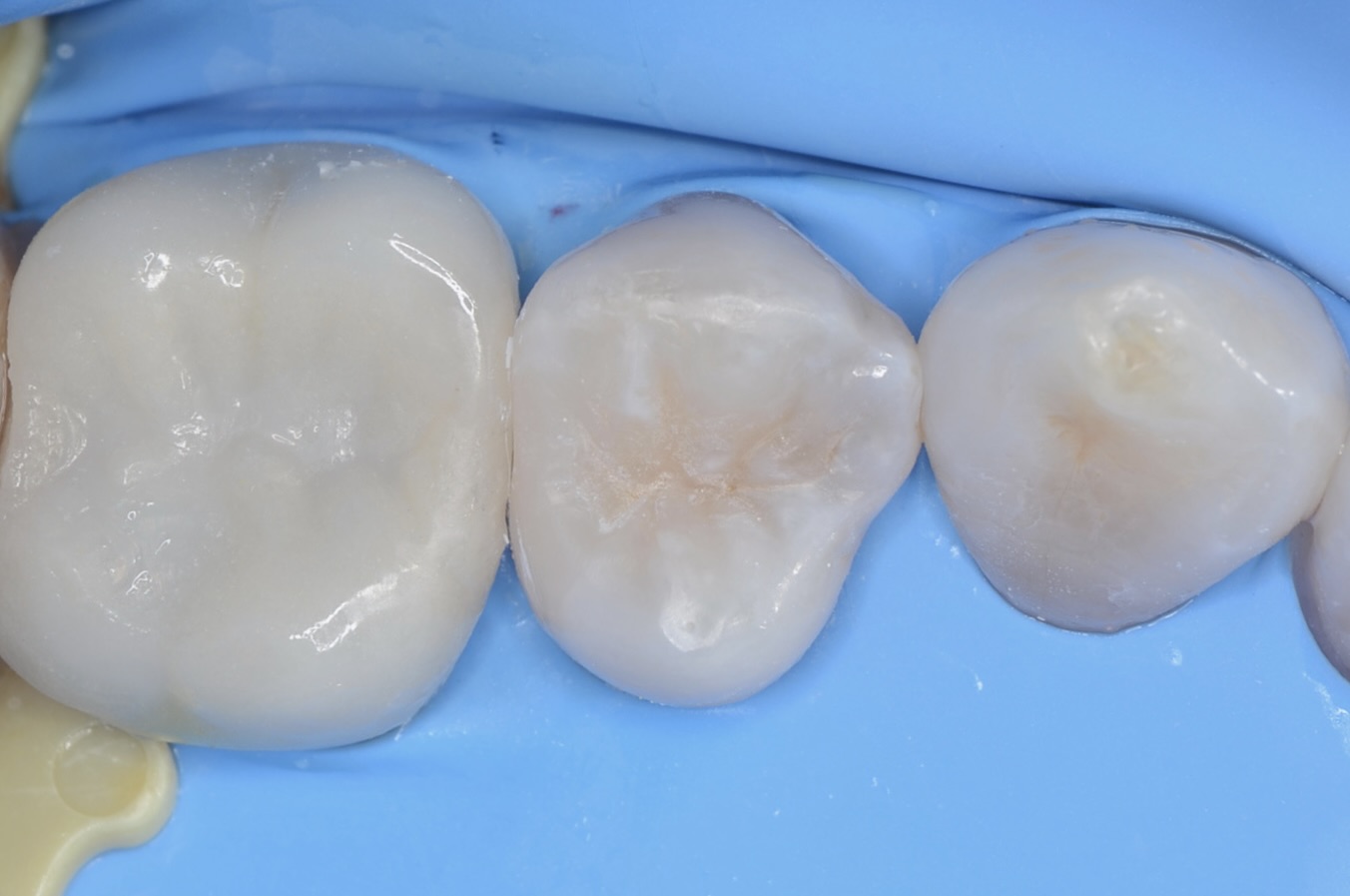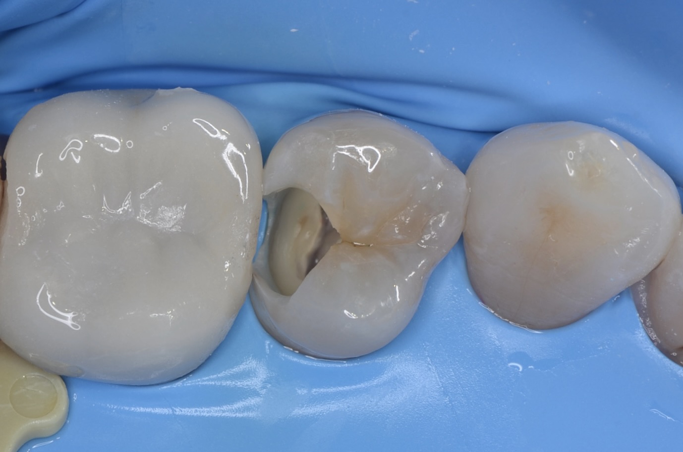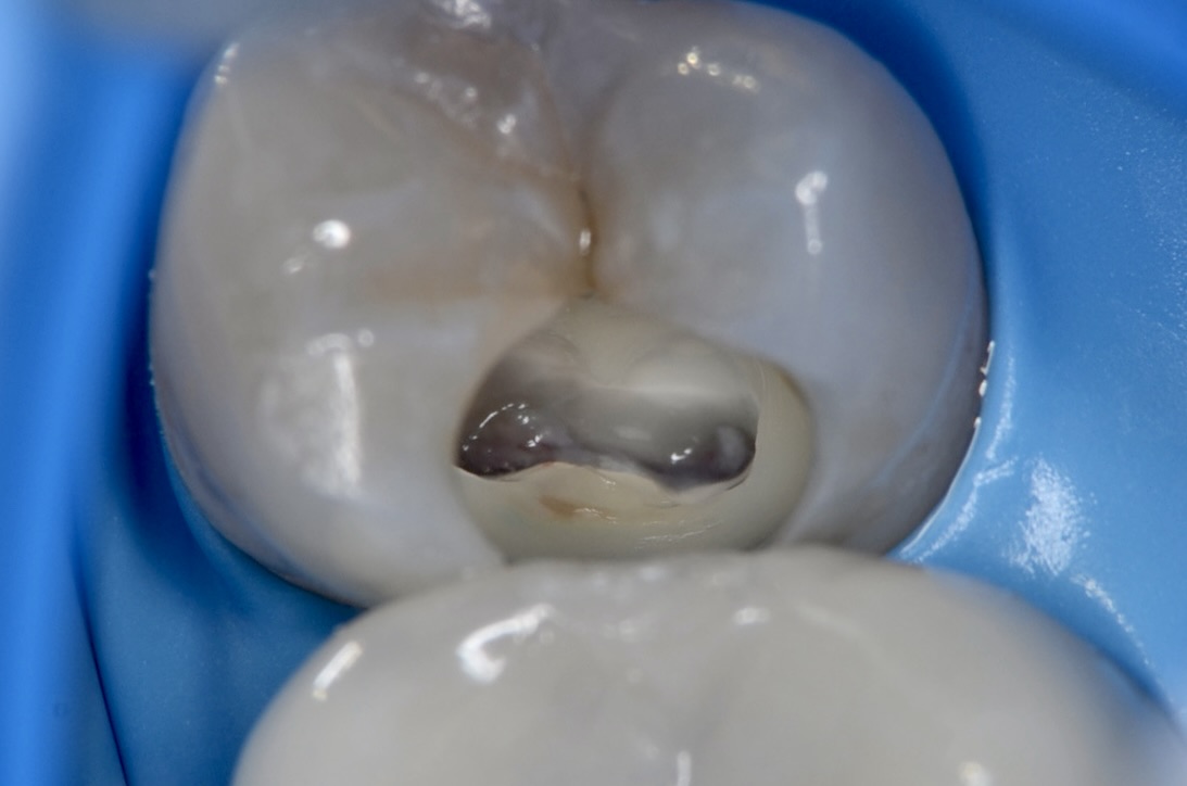 虫歯を青い齲蝕検知液で染めました。 虫歯が歯の中で広がっています。 -