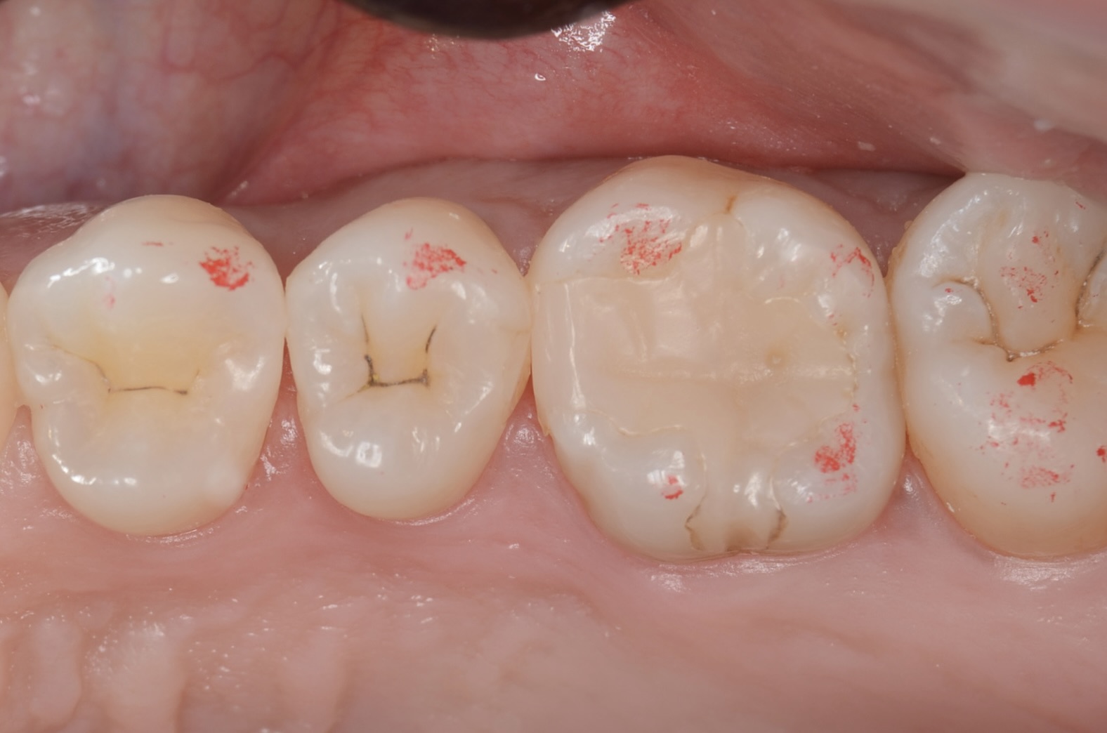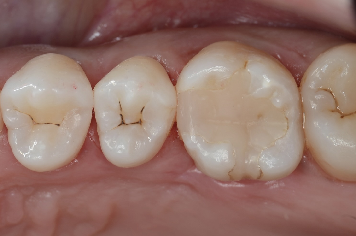 よくよく見ると5番遠心の古いレジンがはみ出しています。これではフロスが引っかかるのも無理はありません。 -