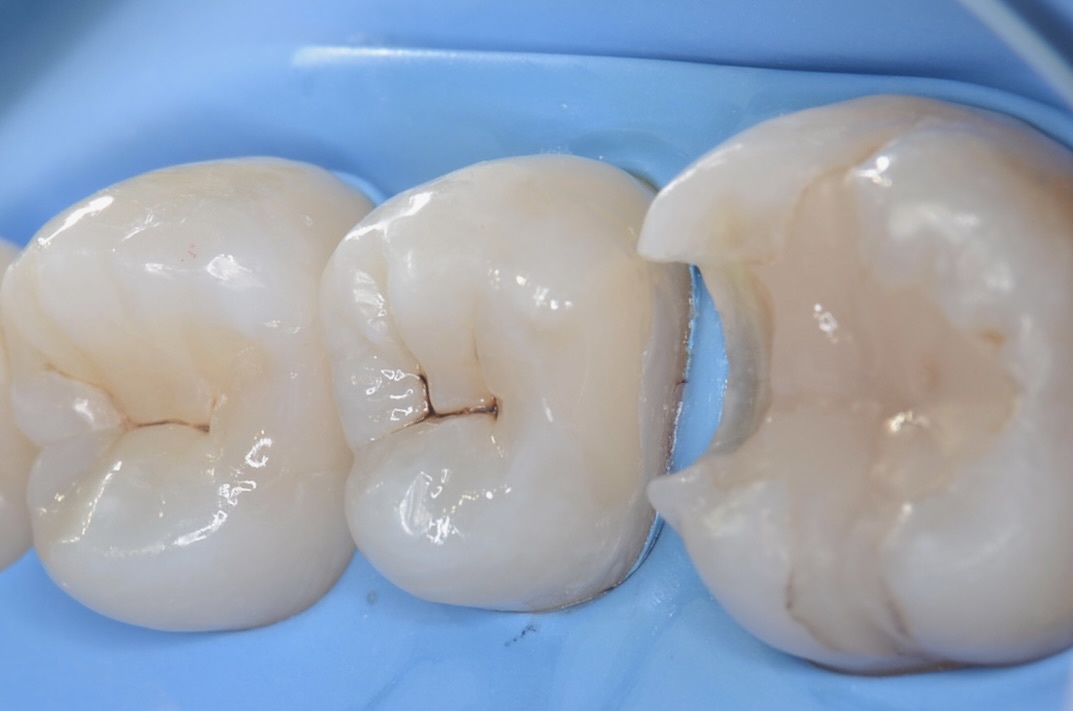 咬合面にはペースト状のレジンで、形態を作りました。天然歯の自然な形態を模倣してレジンを充填しました。 -