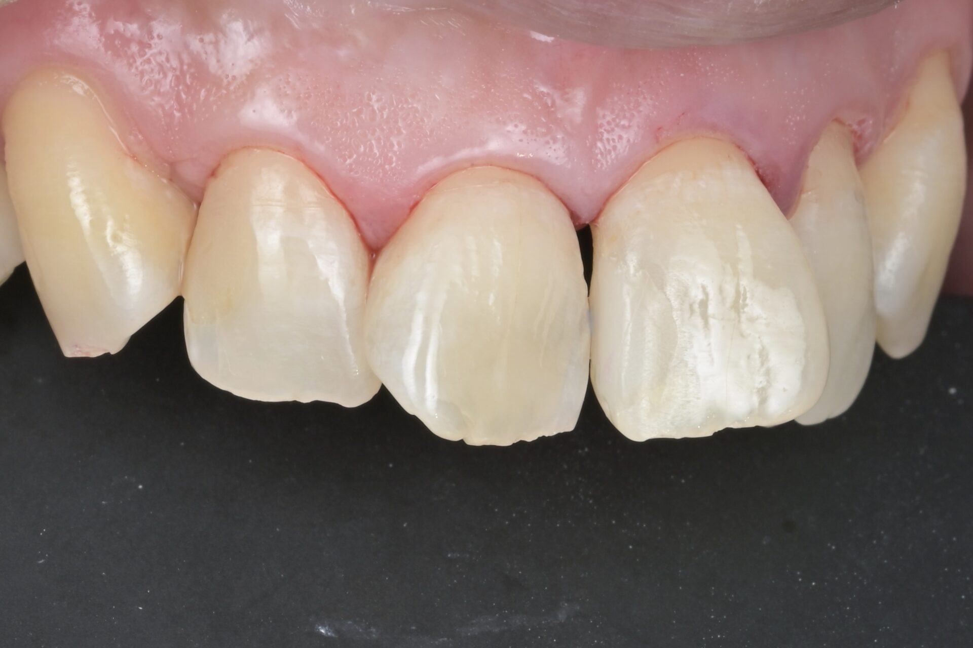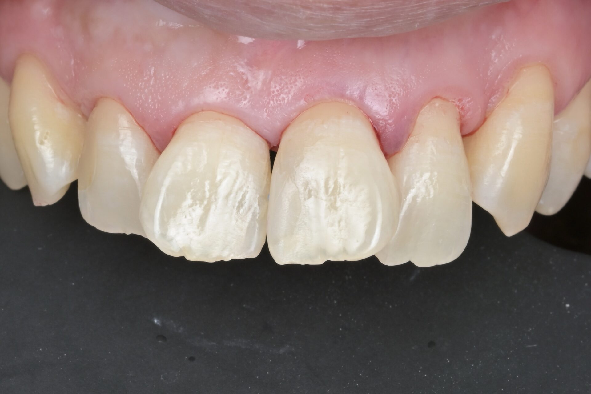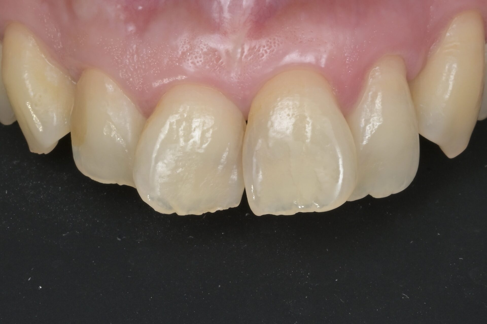 前歯の歯と歯の間にレジンで治療されていました。 そこが虫歯になっていたので、再治療となります。 -