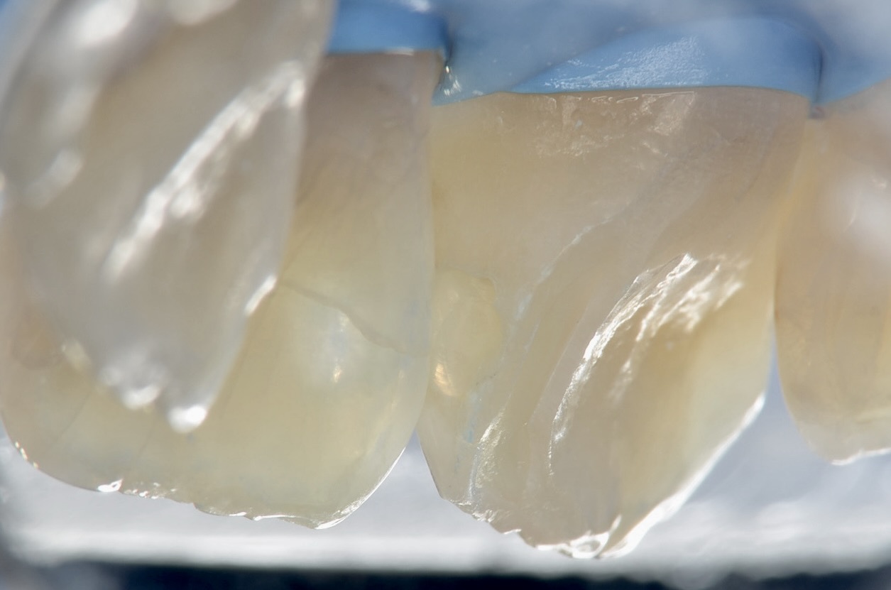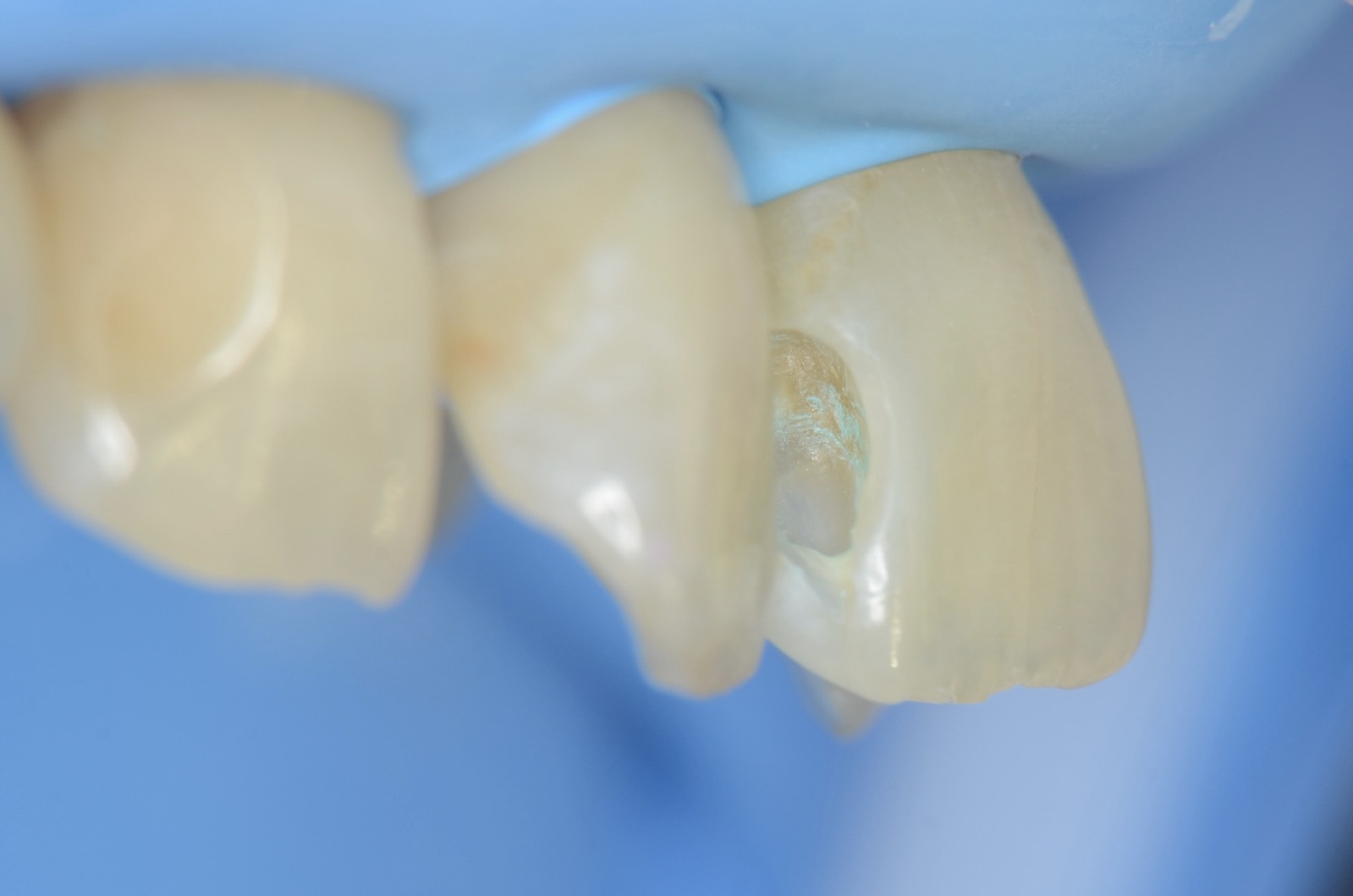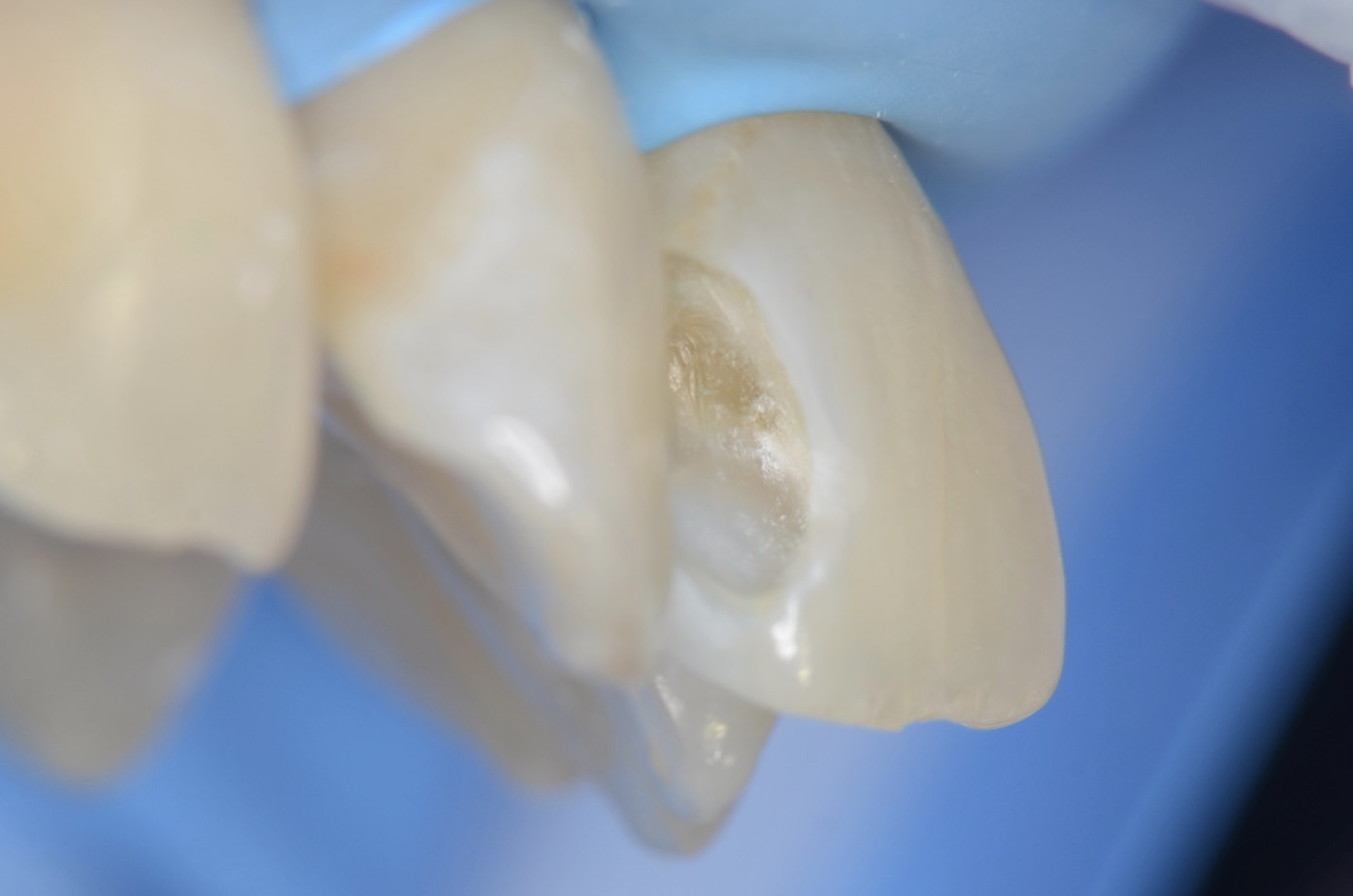 古いレジン(プラスティック)を外して虫歯治療をします。青い齲蝕検知液で虫歯を染めます。奥の方が青く染まっています。 -