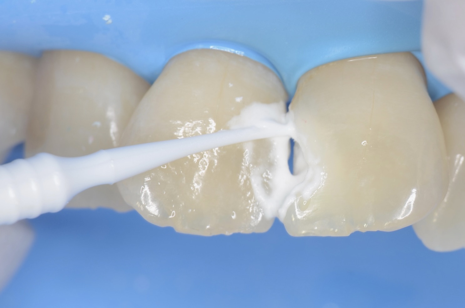 充填後、フロスを歯間部に通して引っ掛かりや適切な接触強さを確認しています。 -
