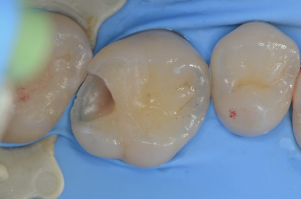 青い齲蝕検知液で虫歯を染めて染まった部分を削ります。この工程を青く染まらなくなるまで歯にできるだけダメージがないように優しい力で丁寧に行います。この作業は時間がかかります。保険診療の短い時間で行うことは限界があります。 -