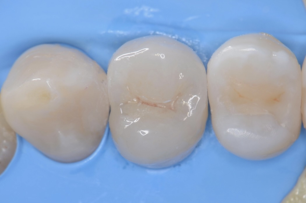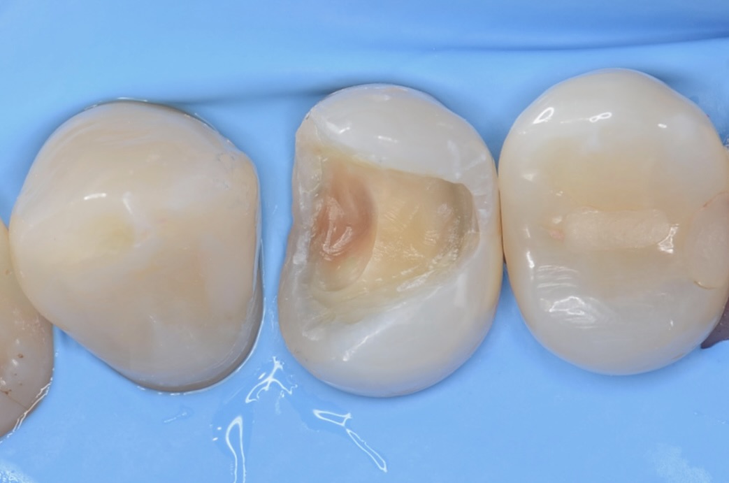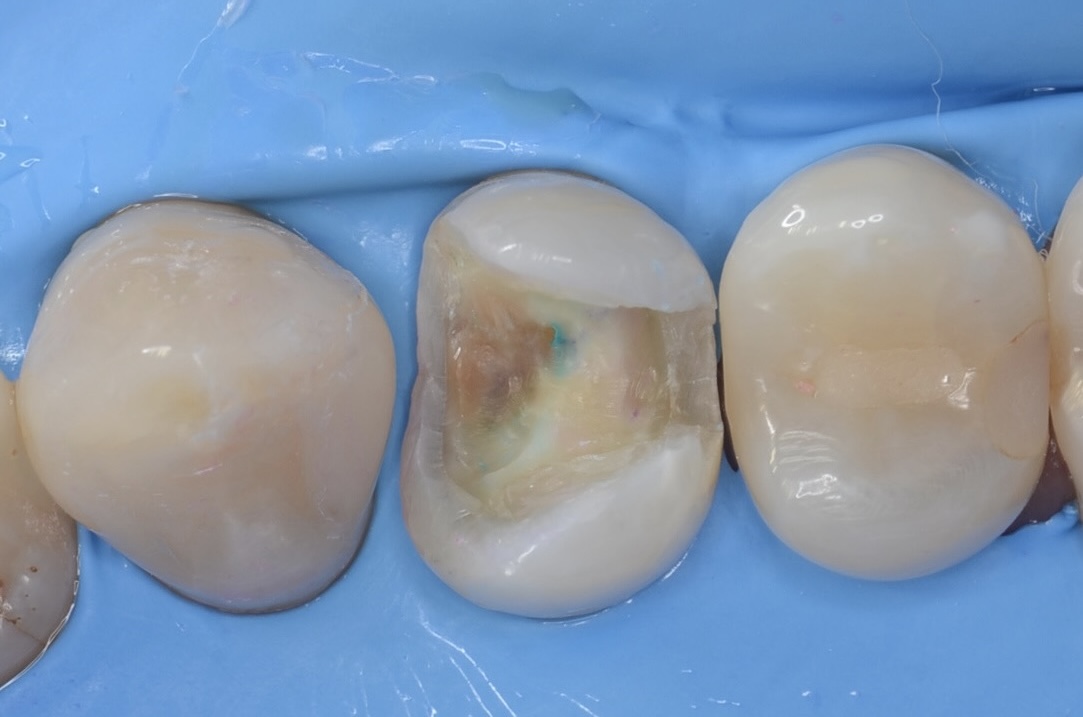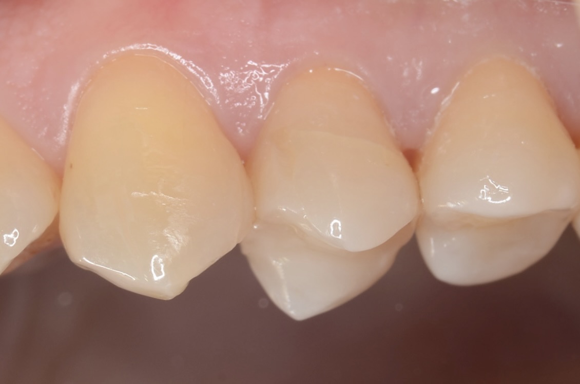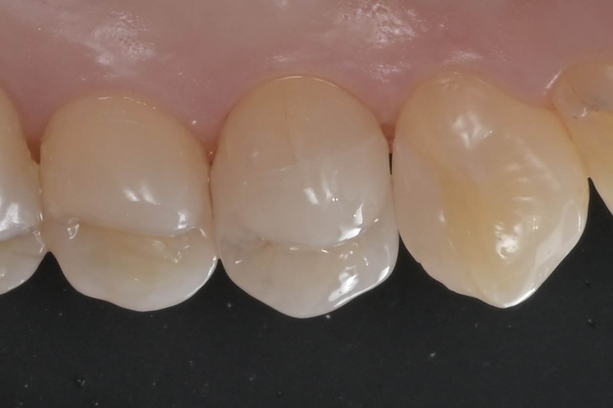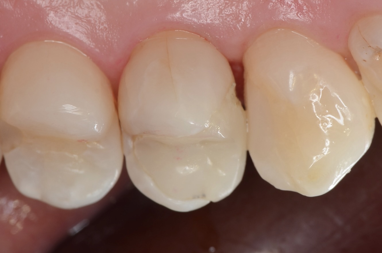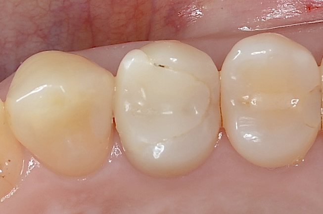 歯の横にヒビが入っています。薄い歯質を無理に残しても脆いだけなので、あえて削ってセラミックに置き換えた方が長持ちします。 -