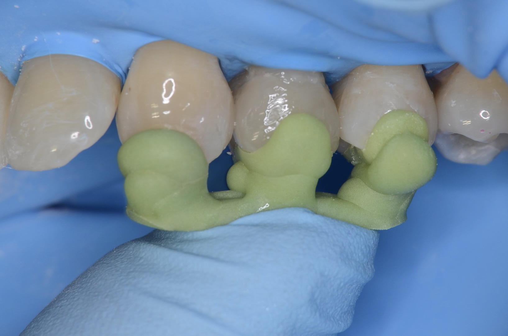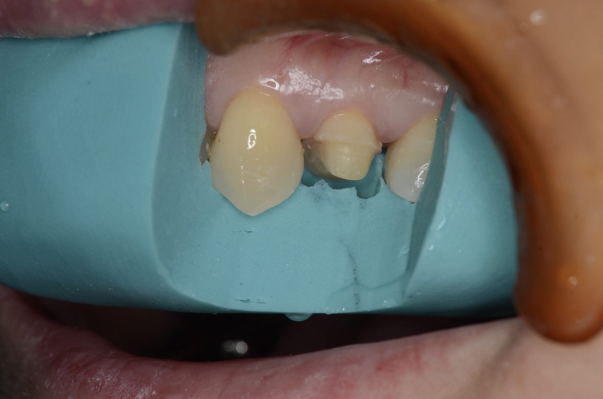 テーブルトップにするためには、エナメル質との強固な接着が鍵となります。その為には歯の解剖を考え、できるだけエナメル質の面積が最大になるように立体的にイメージしながら歯を削ります。 虫歯治療においてもラバーダム装着は必須です。 唾液や血液から歯面が汚染されるのを防ぎ、乾燥状態を保つラバーダムは、接着力を向上させるためにも大切なアイテムです。 -