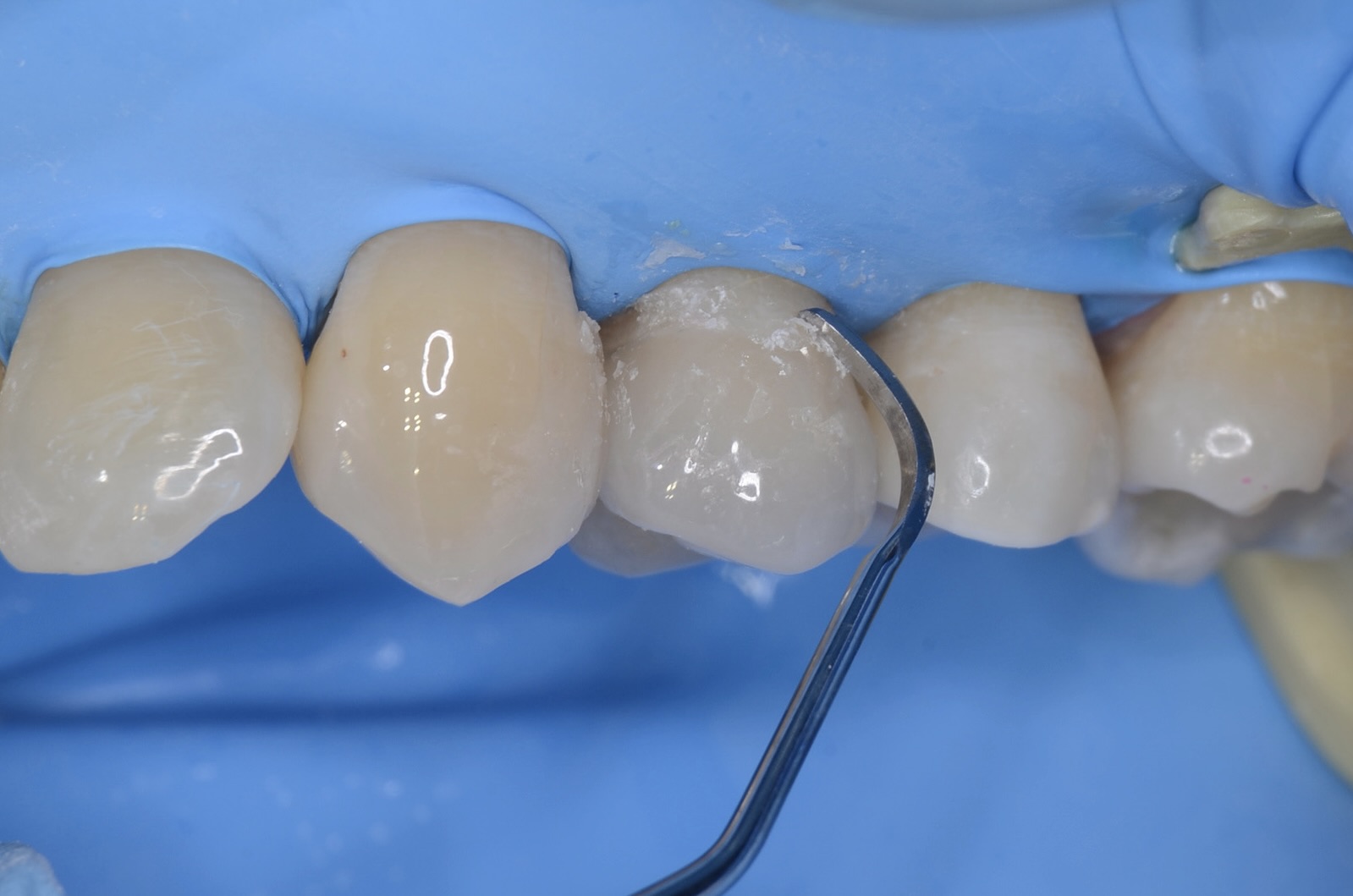 レジンセメントは歯の色をしているので、よく見ないとわかりません。キュレットという歯石をとる刃物を使いはみ出した余剰セメントを剥がしていきます。 -