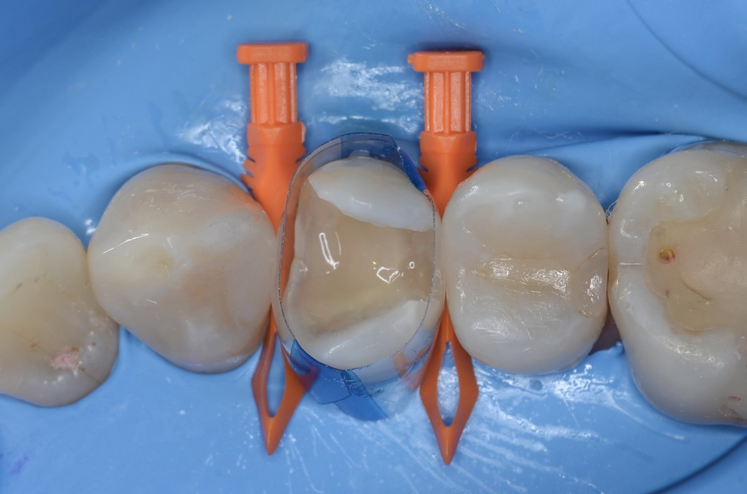 虫歯治療においてもラバーダム装着は必須です。 唾液や血液から歯面が汚染されるのを防ぎ、乾燥状態を保つラバーダムは、接着力を向上させるためにも大切なアイテムです。 -