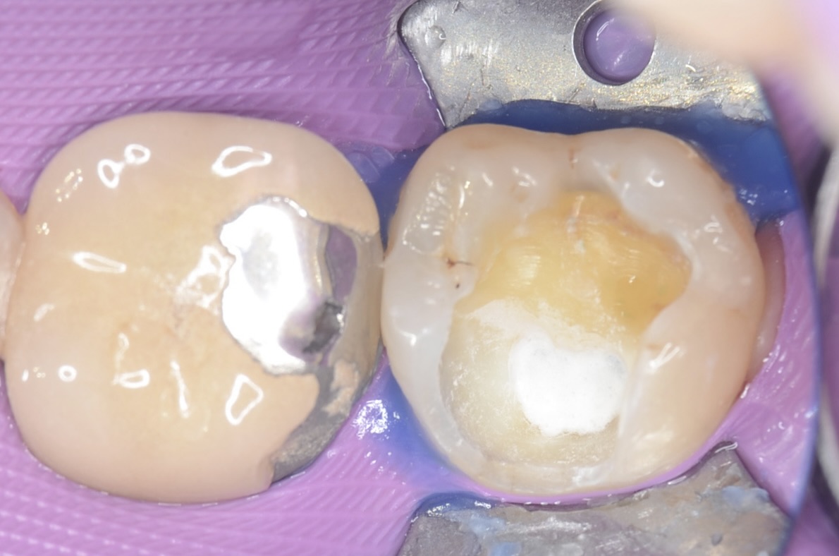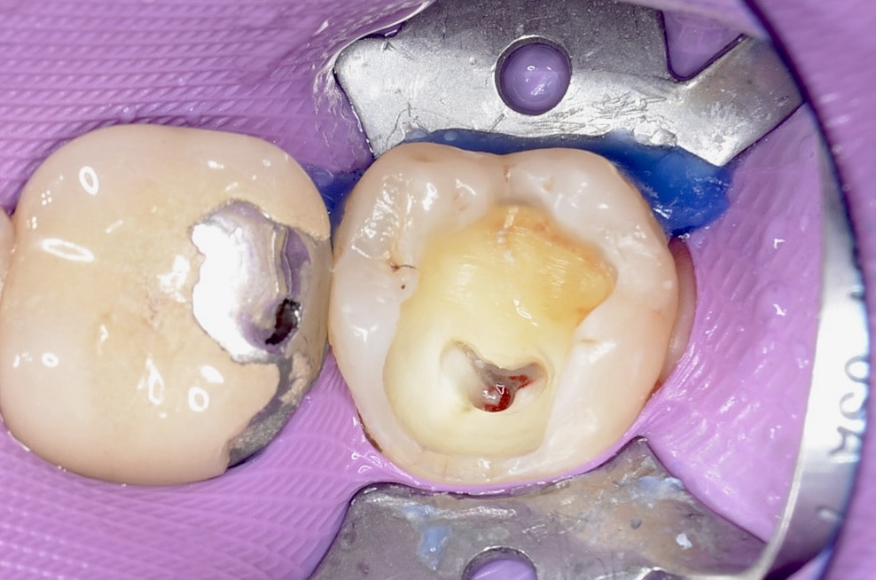 完全に齲蝕を取り除くと露髄しました。数分後には自然止血しました。 -