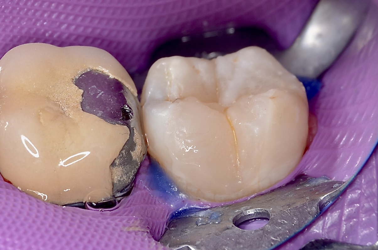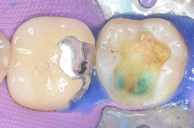 齲蝕検知液で染めると、虫歯の巣寸が青く染まっているのがわかります。これを確実に削り取ります。 -