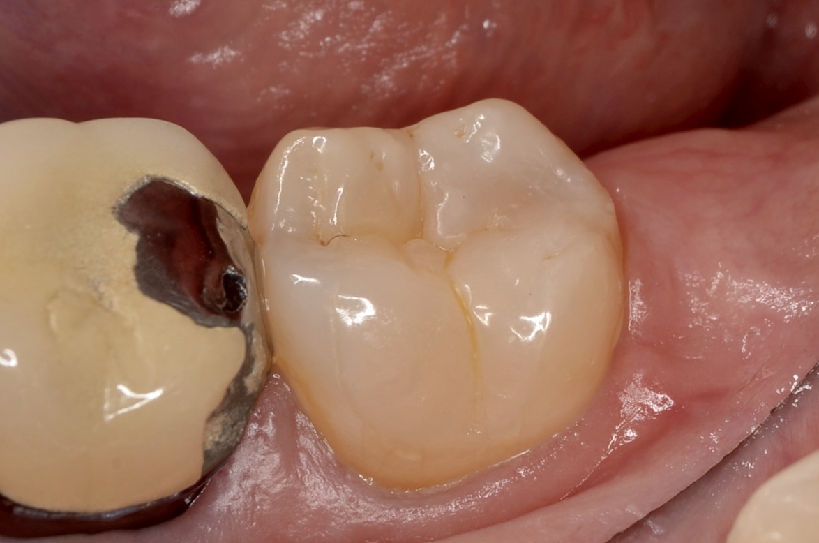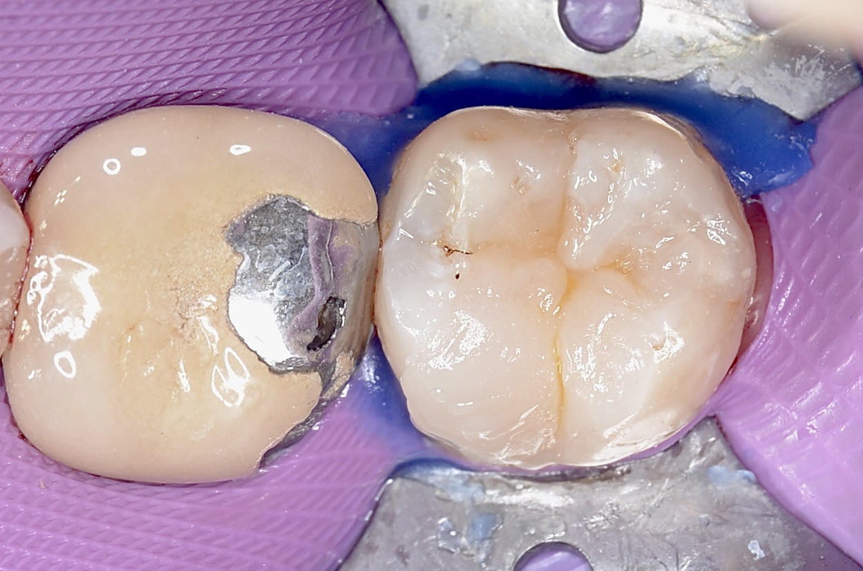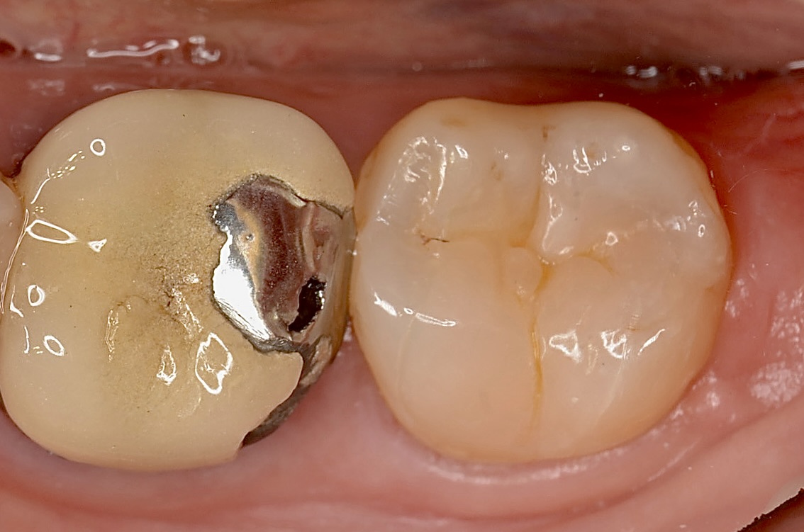 ずいぶん昔にレジン充填しています。昔のレジンなので変色しています。今のレジンは高性能になっていて変色しづらくなっています。 -