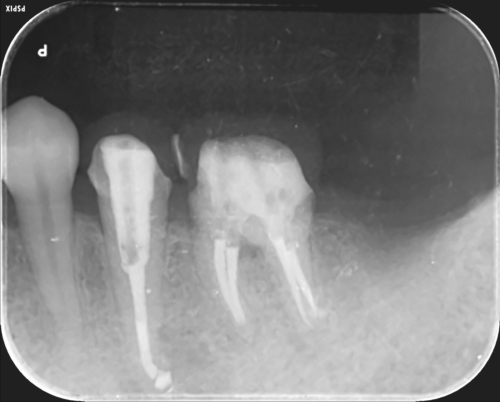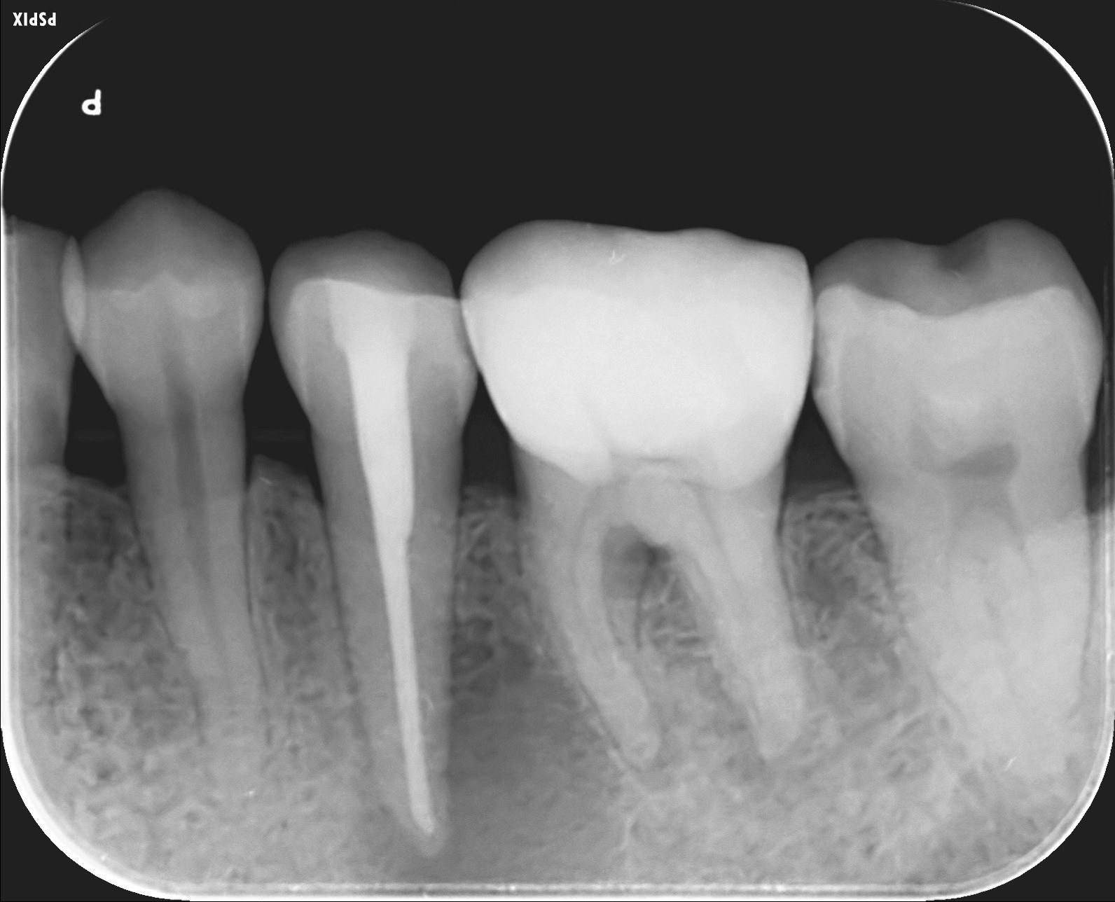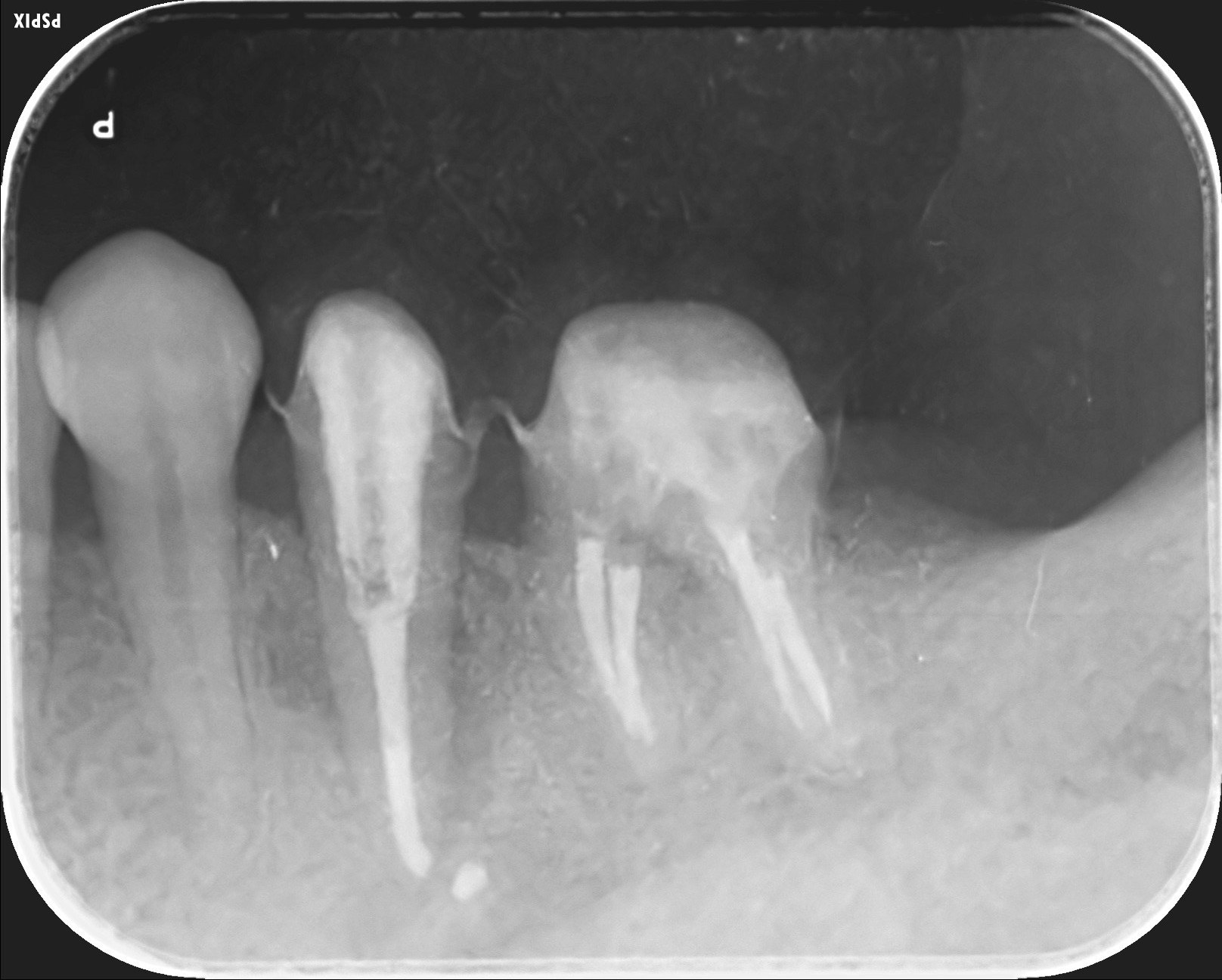 左下5番の歯根を黒く取り囲む根尖病変が認められます。 -