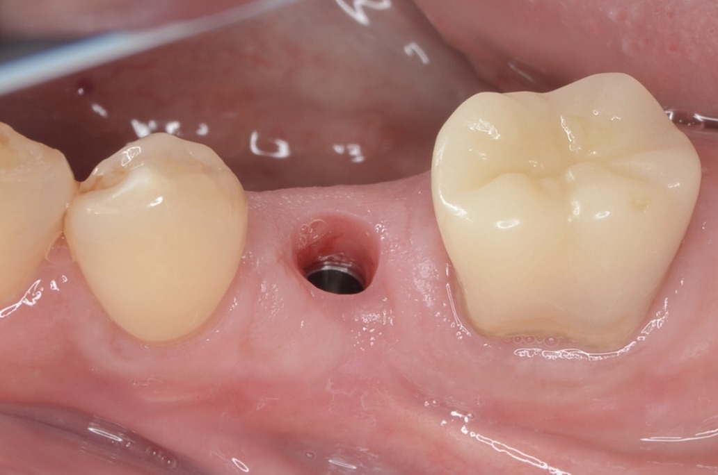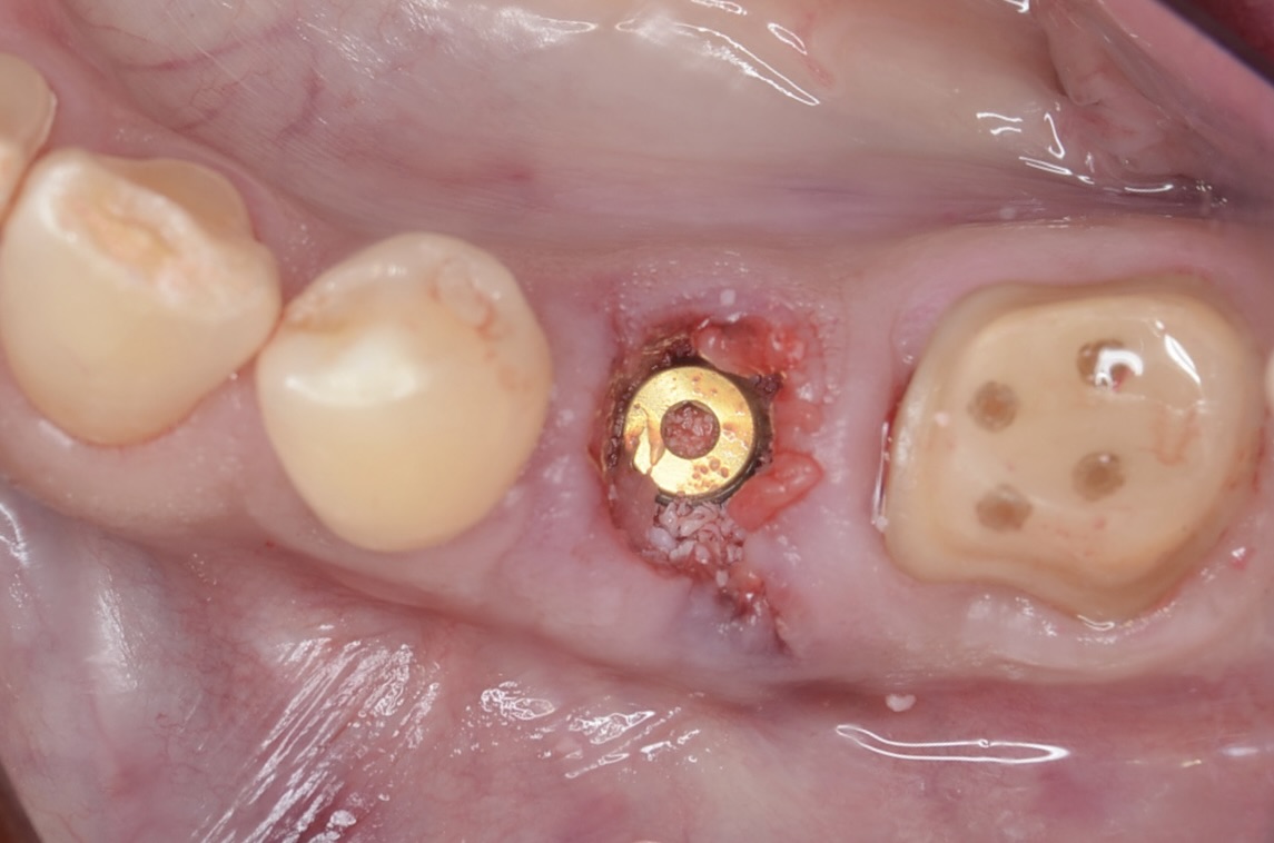 抜歯と同時にインプラントを埋入。インプラントと骨の隙間にはコラーゲンや骨補填材を詰めています。 -