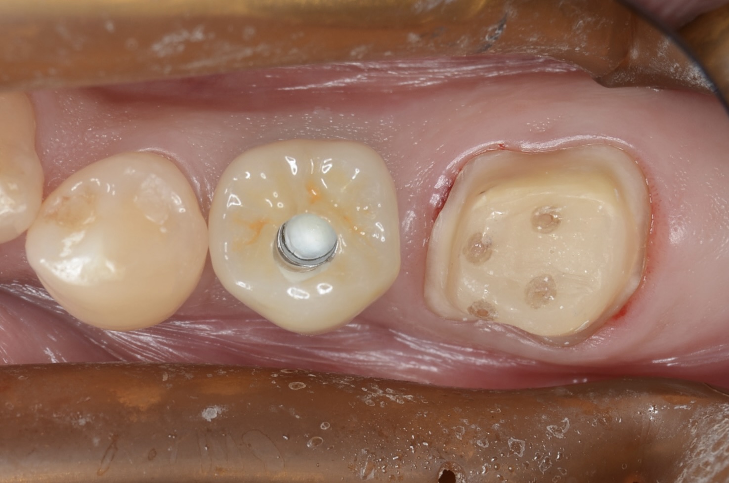 まずインプラントからセットします。アクセスホールをレジンで埋めるので、ネジ穴にレジンが流れないように仮の蓋を入れておきます。 -