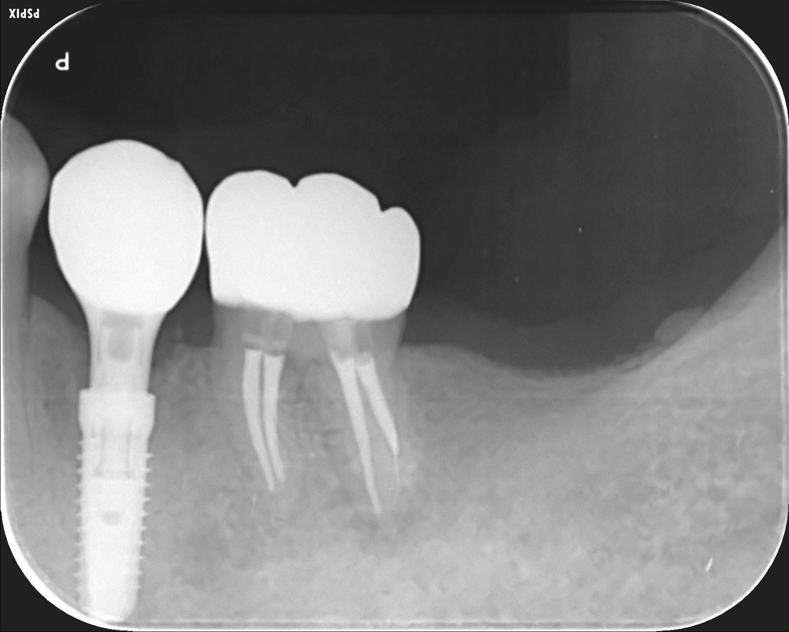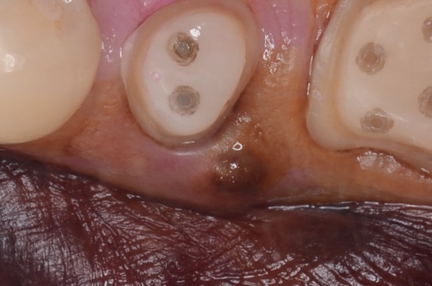 後日、歯根破折を起こしたのでインプラントを抜歯即時埋入しました。神経のない歯はいつ割れてもおかしくないという教訓になった症例です。
