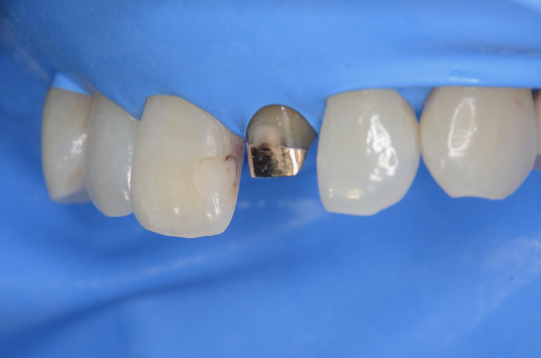 CTで確認しても根管治療は問題なく金の土台が入っています。少しだけ虫歯になっていましたが再形成すれば問題ないと判断しました。 再形成後に型取りをして、右の前歯の治療後にダイレクトボンディングでどれくらいの形にするべきか?左のセラミッククラウンをどれくらいの形にするべきかを予測するために仮歯を作ることにしました。 -