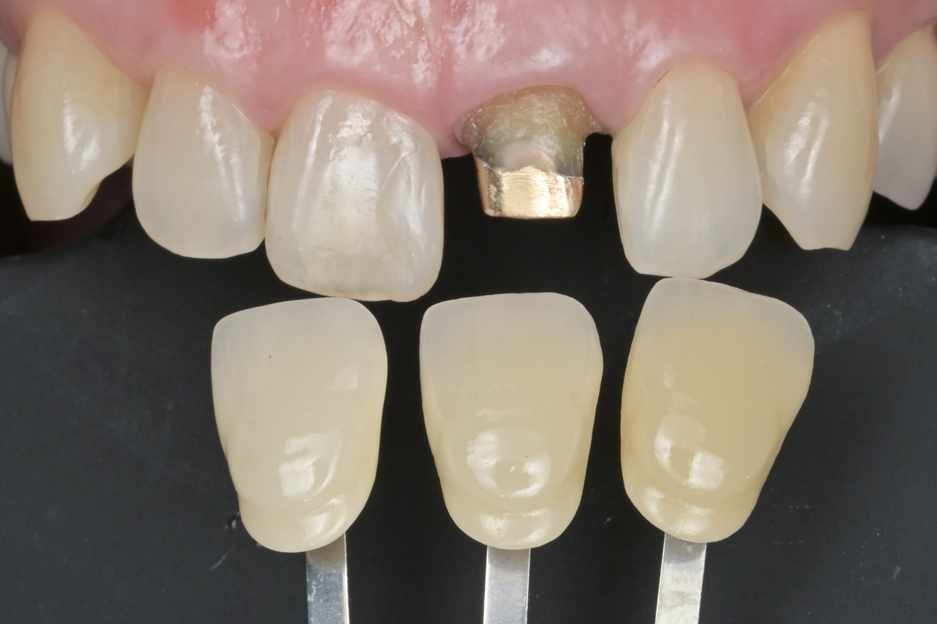 セラミッククラウンを作るために色合わせをします。この後型取りをします。 -