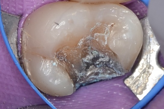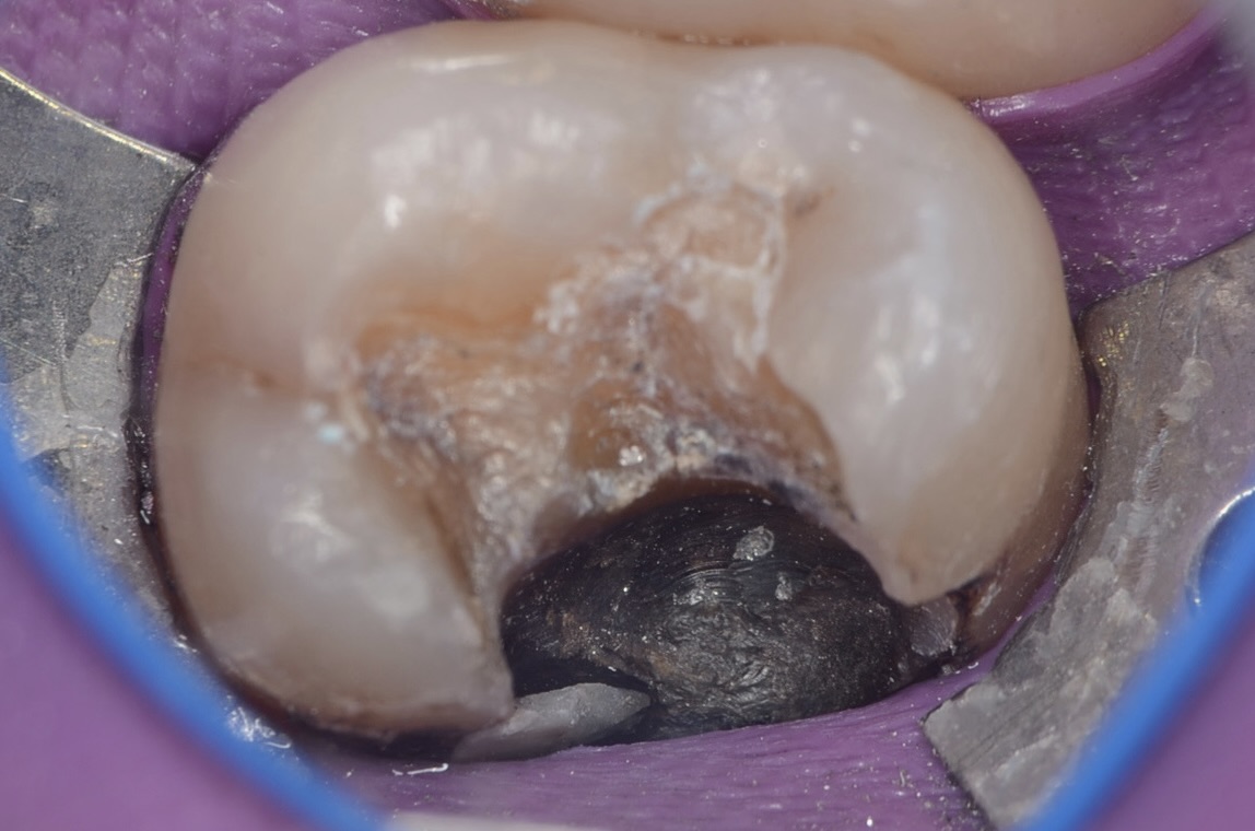 歯質がアマルガムによって黒く変色し、虫歯にもなっています。 -