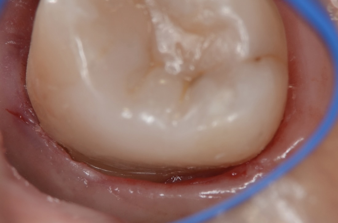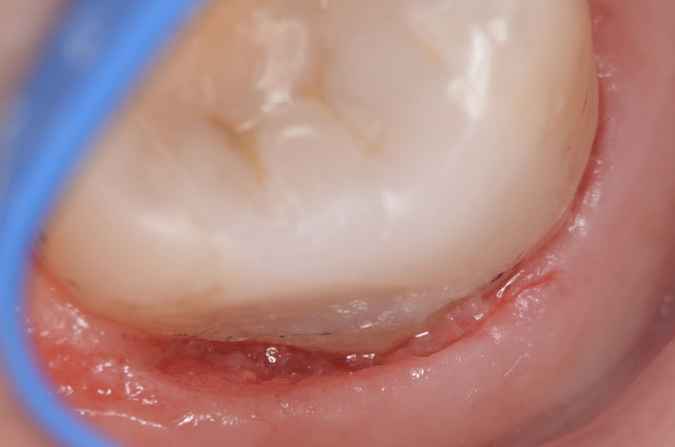 歯と歯茎の境目にテフロンテープのこよりを挿入しわずかな隙間を作ります。 -