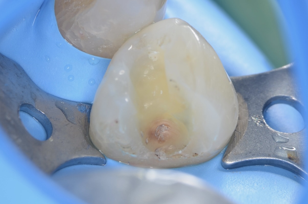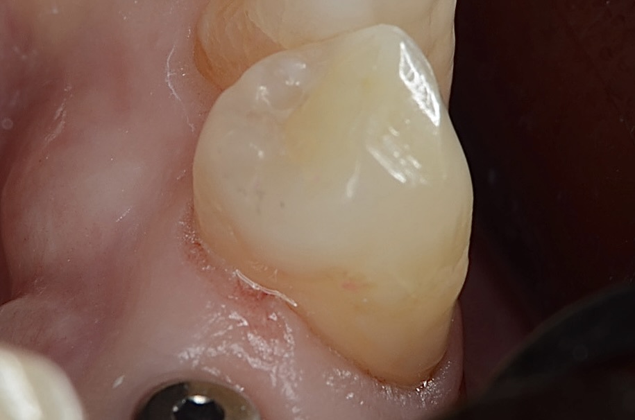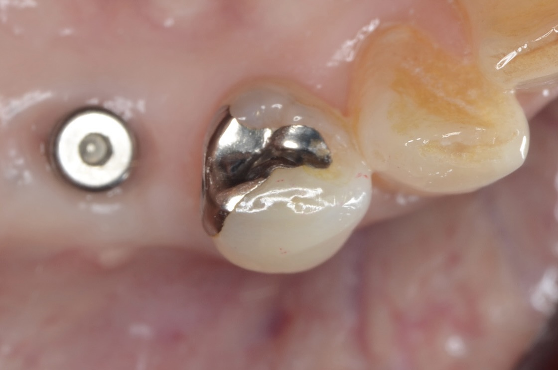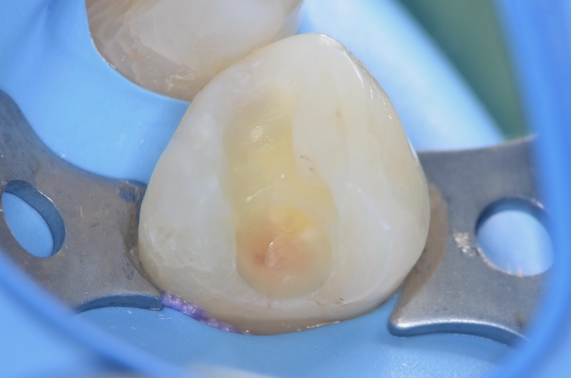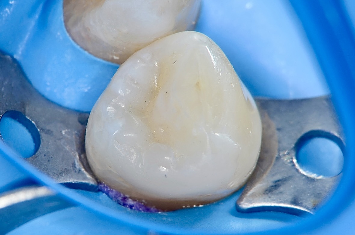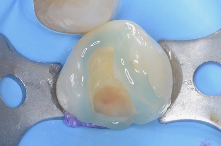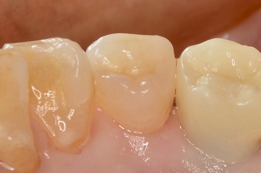 右下4番の小臼歯の治療です。古い銀歯と頬側歯頸部の虫歯になっているレジンをだイレクトボンディングで治療します。