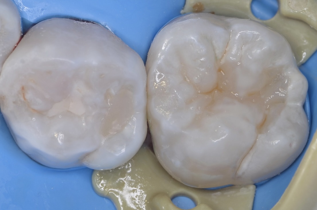 一気にレジンを充填して硬化させるとレジンの重合収縮によりレジンが、歯から引き剥がされる力がはららいてしまうので。少量づつレジンを充填硬化させます。 深い部分は色の濃いレジンを使うと、溝の部分が濃く見えてリアルさが出てきます。 -