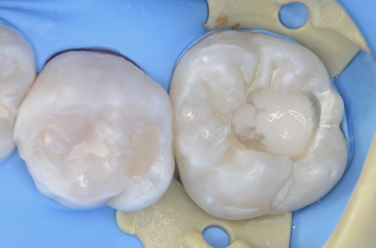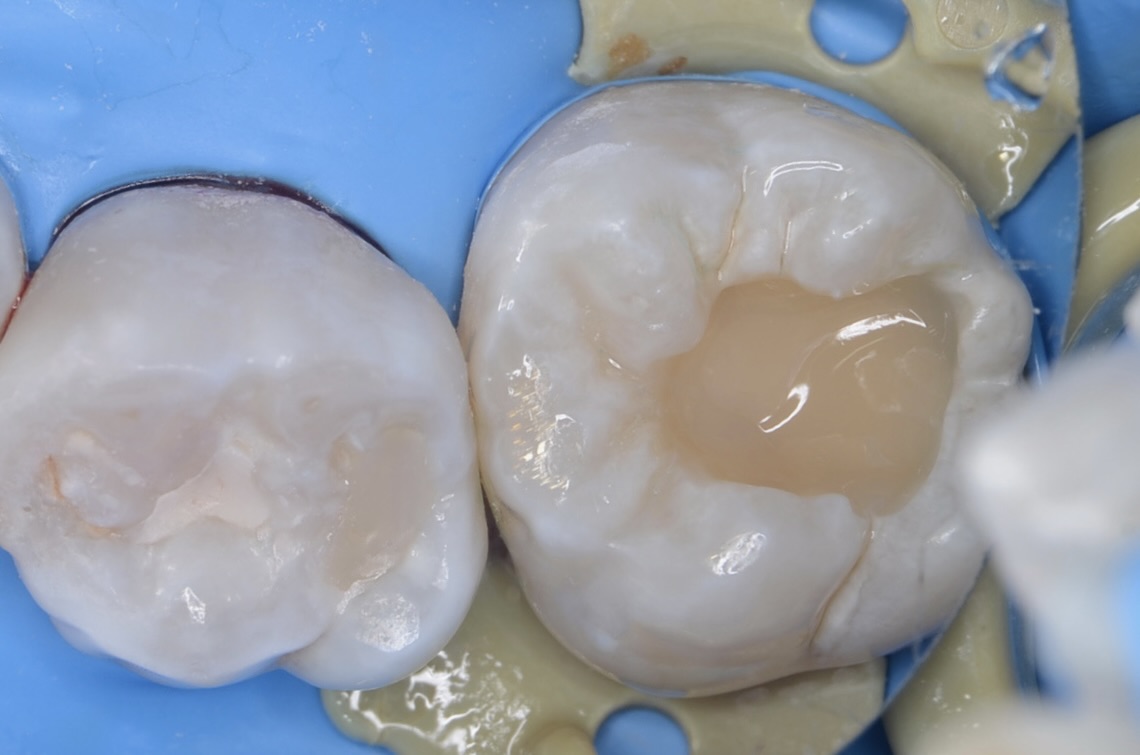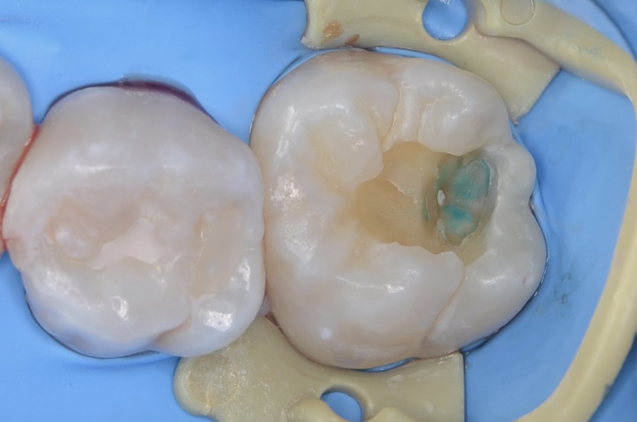 青い齲蝕検知液で虫歯を染めて染まった部分を削ります。この工程を青く染まらなくなるまで歯にできるだけダメージがないように優しい力で丁寧に行います。この作業は時間がかかります。保険診療の短い時間で行うことは限界があります。 -